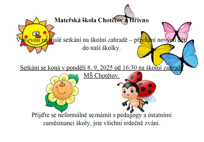 Srdečně Vás zveme na první neformální setkání se zaměstnanci školky.